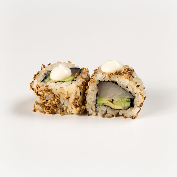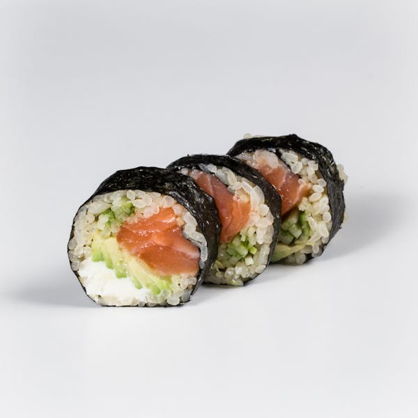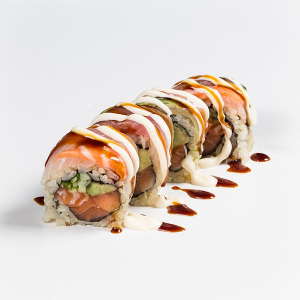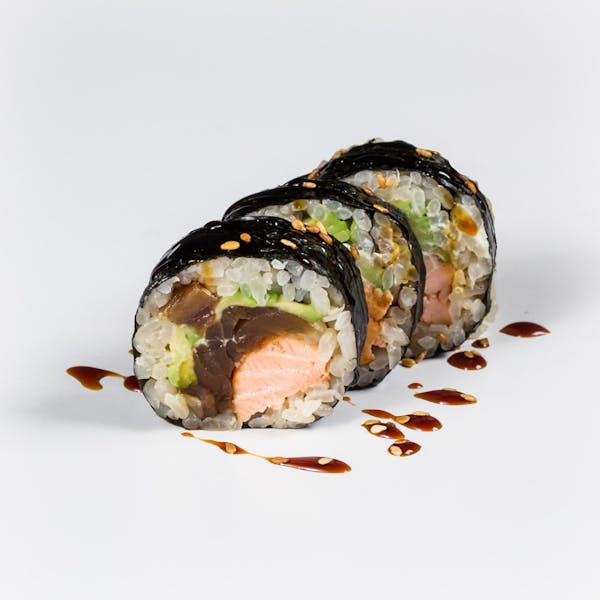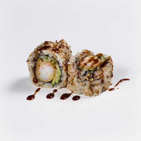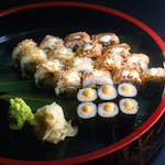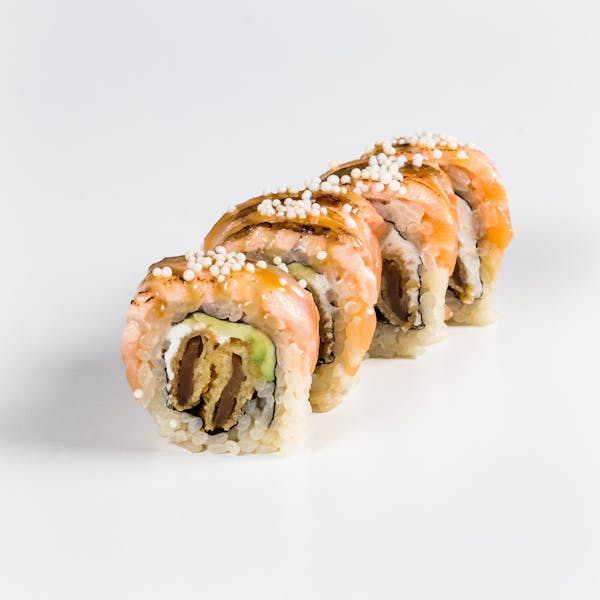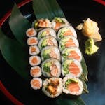 California z krewetkami w tempurze, futomak grilowany łosoś, 4x nigiri łosoś -